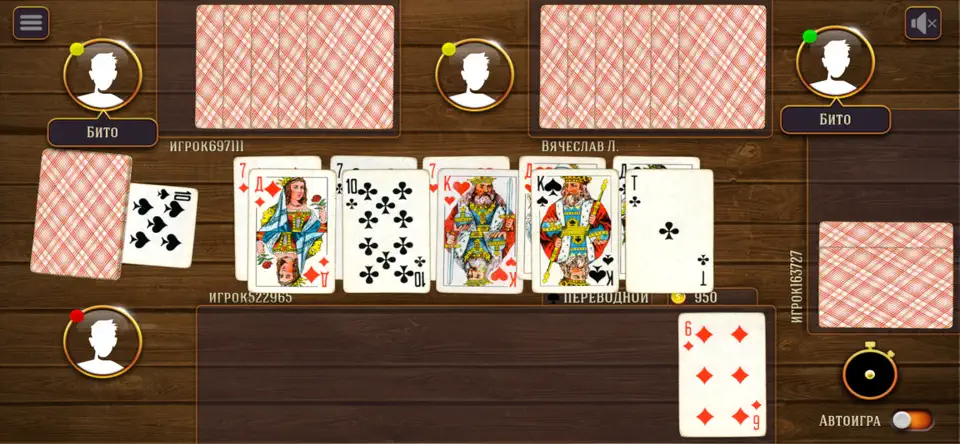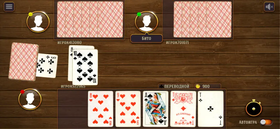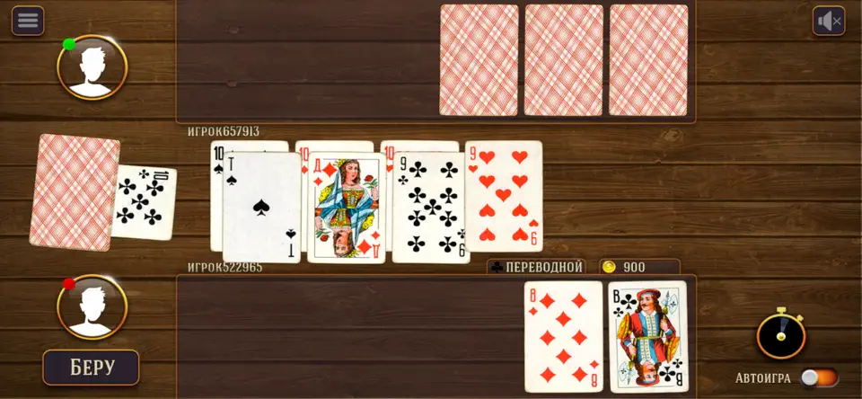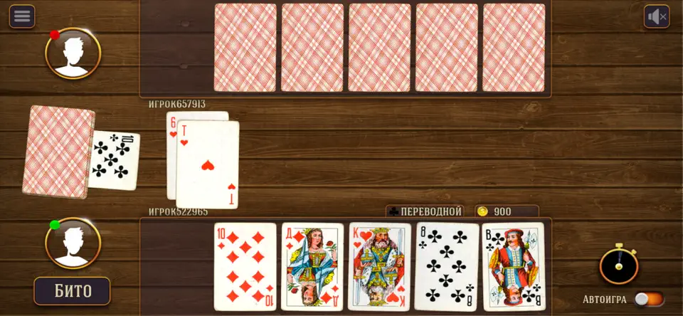 Это цифровая версия самой популярной в России и странах СНГ карточной игры. Правила знакомы каждому: игроки ходят по очереди, пытаясь избавиться от своих карт, а последний, у кого они остаются, объявляется «дураком». Просто? На первый взгляд — да. Но в онлайн-версии добавляется новый уровень азарта, ведь вы играете не с бездушным ботом, а с живыми людьми, каждый из которых хитрит и пытается вас переиграть. В игре доступны все классические разновидности: подкидной, переводной, а также возможность играть один на один или компанией.